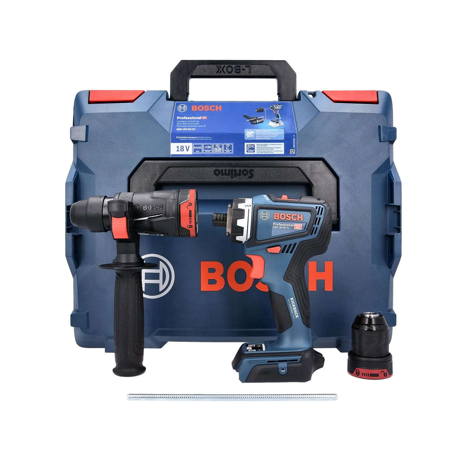 The powerful GSR 18V-90 FC Professional is part of the Bosch Professional FlexiClick System, which prepares for all challenges on the jobsite: The Excenter attachment allows to work closely to edges and walls, while the Right angle attachment turns the drill driver into an angle drill. These attachments can be locked in 16 different positions at a 360° angle, without removing them from the tool. Attaching the unique hammer attachment GFA 18-H turns the tool into a fully-fledged SDS plus rotary hammer, ready for effortless hammer drilling into concrete up to Ø 10 mm. With a head length of only 136 mm and a max. hard torque of 64 Nm, you have a highly compact and powerful tool at hand. The Bosch Professional FlexiClick System – perfectly equipped for a professional job.