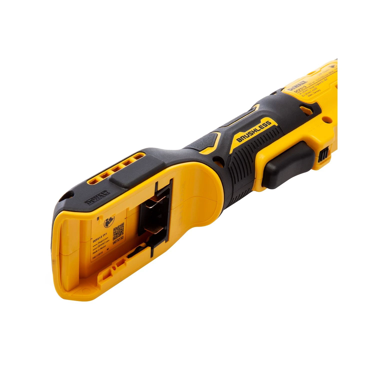 The Dewalt DCF513N 18V XR Open Head Ratchet has a 3/8 Inch Drive with an ergonomic trigger and comfortable rubber grip. It is fitted with an LED work light for maximum visibility in darker conditions. The ratchet also includes variable speed control and can be operated in forward or reverse modes.
