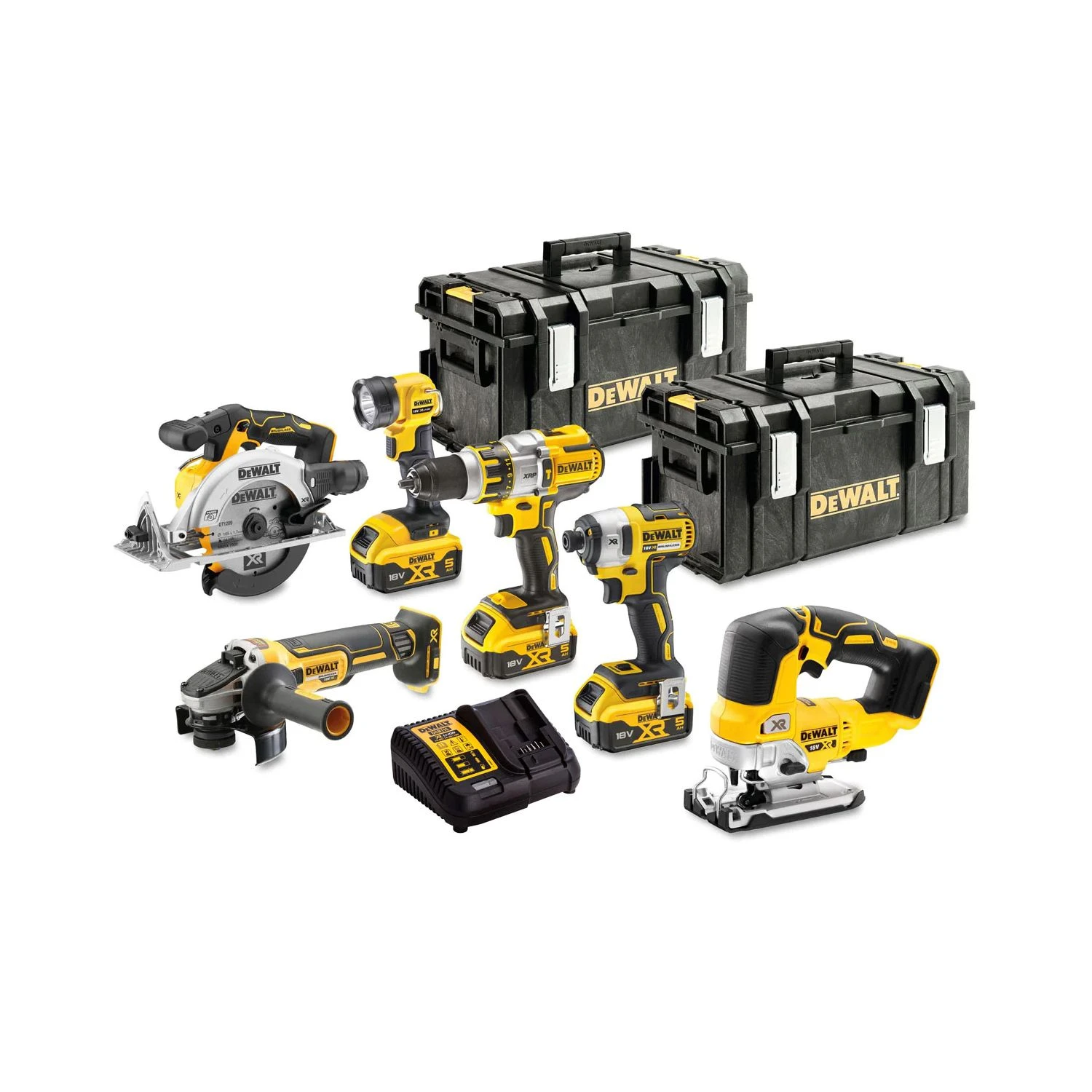 The DEWALT DCK664P3-GB 3x5Ah 18v BL Cordless Kit 6pc contains an impressive array of tools including a hammer drill, impact driver, circular saw, jigsaw, angle grinder, and work light. This kit features tools that can tackle a wide range of applications from drilling to sawing to grinding, and includes three batteries, a charger, and two TSTAK boxes for storage and transport. Essential for DIY professionals.